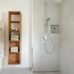 The property is furnished with a sofa set featuring modern facilities like a flat-screen TV with satellite channels. A bathroom has a separate toilet and a shower, as well as a hairdryer and towels.